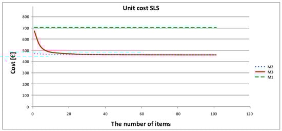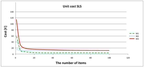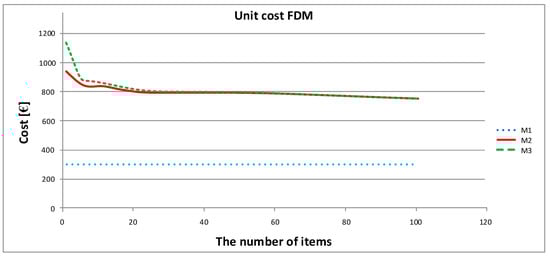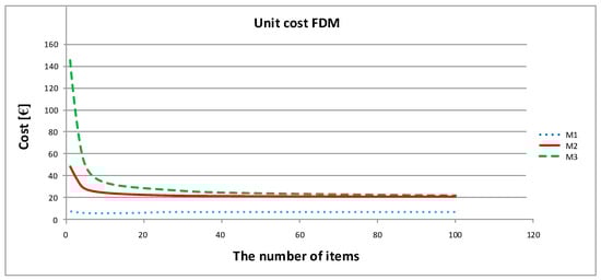 Analysis of the obtained results shows that the model based on the proposed framework M3 is extremely flexible, and is characterized by the low production costs of its prototype elements when the number of manufactured elements is greater than 15, which confirms the legitimacy of this model’s use in the production of around a dozen pieces. This model has also great advantages associated with its ability to select print parameters individually for each sample in a given series. Process 1, despite having the lowest production costs, is often characterized by the highest entry threshold cost in each of the technologies studied, which is associated with the purchase of equipment and the need to hire an employee to operate that equipment (Table 3). However, for a large manufacturing company that intends to implement many prototypes incrementally for its own needs or for external orders, the long-term use of M1 is profitable.