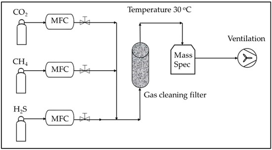 The schematic diagram for testing the H2S removal capability of the three selected samples is shown in Figure 1. A mixture of gases (CH4-to-CO2 ratio at 1.5 and H2S at 200 ppm(v)) was used as simulated biogas. The mixture of the gas inlet was controlled by three individual specific mass flow controllers (Bronkhorst EL-FLOW, NL), to simulate an average biogas mixture deriving from the anaerobic digestion of organic waste. This concentration is representative of real biogas as reported in the literature [40,41,42]. These sorbent materials were placed in Teflon tubes with an internal diameter of 25 mm. The aspect ratio between the sorbent height and plastic tube inner diameter is ~8.33. To remove residual gases inside the pores, the samples were pre-treated using 200 NmL min−1 N2 flow for 30 min at 120 °C. A gas flow of 919.9 NmL min−1 was used for the H2S removal performance testing. The gas outlet was analyzed by a mass spectrometer (MS) (QGA, Hiden Analytical Ltd., UK) to monitor the online H2S concentration. The H2S removal tests were repeated for each sample to prove the reliability of the H2S removal capability.
