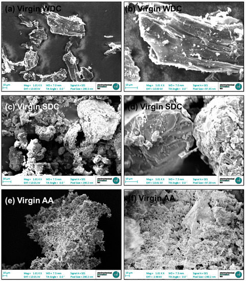 SEM micrographs of virgin WDC (a,b); virgin SDC (c,d); virgin AA (e,f).