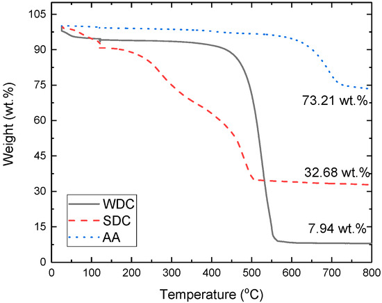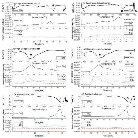 In Figure 6a–d, peak A in the derivative thermal gravimetric (DTG) curves at temperature ~100 °C indicates the removal of moisture in the samples. The results reveal that WDC and SDC contain such an amount of moisture, but not the AA sample, according to the DTG and mass spectrometry results in Figure 6. In Figure 6a–d, peak B at ~620 °C and peak C at temperature ~780 °C, and in Figure 6e,f, peak A at temperature ~750 °C and peak B at temperature ~780 °C are associated with the emission of CO2 from the adsorbent materials. The results are also supported by Hervy et al.’s research [33], that the CO2 emitted from adsorbents under the same TGA program at temperatures ~200, 620 and 750 °C; the H2S emitted from adsorbents at temperature ~370 °C; and the SO2 emitted at temperatures ~285 and 370 °C. There is no obvious SO2 or H2S emitted from the virgin and spent adsorbent materials could cause by the relatively small amount that the equipment is not sensitive enough.