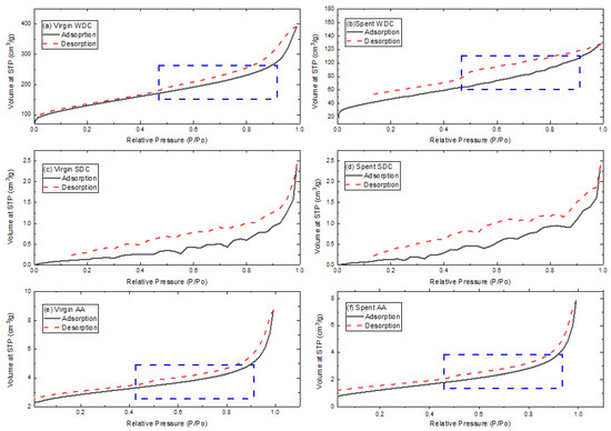 Figure 4a,b,e,f exhibit kinds of type IV or V isotherms according to the IUPAC classification, indicative of the presence of mesopores within the virgin and spent WDC and AA samples [54,55]. The hysteresis for virgin and spent WDC and AA samples adsorption isotherms shown in Figure 4a,b,e,f could relate to the morphological properties of the sample. The morphological properties have been summarized by other researchers which include the pore size distribution, pore geometry and connectivity of the porous materials [55,56]. The shape of the adsorption hysteresis loop exhibited similar as H3 shape indicates the porous material could have slit-shaped pores with two ends open, which can be supported by other researchers’ findings [55,57,58]. The slope associated with the hysteresis loop of the adsorption/desorption curves is related to the tensile strength effect [54,55,59]. The highlighted hysteresis curves that are shown in Figure 4b,f indicate the low-pressure hysteresis due to the volume change of the adsorbent. It could be caused by the swelling of the non-rigid pores in the spent SDC and AA adsorbent materials, or the pores have been occupied irreversibly by the similarly sized molecules [55,60].