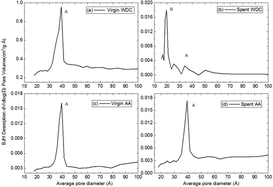 Barrett–Joyner–Halenda (BJH) pore size distribution of (a) virgin WDC, (b) spent WDC, (c) virgin AA and (d) spent AA adsorbent materials.