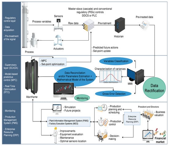 Technological and computer advancement have allowed the wide, easy, and fast access to process data of industrial plants. As a matter of fact, access to actual data are extremely important for real-time monitoring and optimization of production units [9]. The dynamic monitoring of a plant, unit or industrial equipment is increasingly necessary to improve product quality, enhance process safety, and reduce energy costs and waste; however, the acquired information must be reliable and validated with physical process constraints, as the reliability of the data are of paramount importance for any decision-making related to the analyzed process [10]. Nevertheless, process measurements are subject to errors and fluctuations due to intrinsic imprecision, degradation, malfunction, improper installation, poor calibration, and failure of measurement instruments. Additionally, human errors associated with operation and calibration, or gross errors related to the operation of the process, can result in data that do not represent the process reliably. Consequently, measured data are not expected to satisfy physical constraints precisely and are not expected to comply with conservation laws (mass, momentum, and energy balances) [11]. For these reasons, process controllers and data acquisition systems, if not treated properly, can cause the plant to operate at sub-optimal or unsafe operation conditions. In addition, decision-making based on unreliable data can lead to the occurrence of industrial accidents, reduction of product quality, and financial losses [12]. Therefore, the use of data rectification procedures can be essential to improve the quality of the information contained in the data, and consequently provide a margin of reliability for the control and optimization of the process in real time.