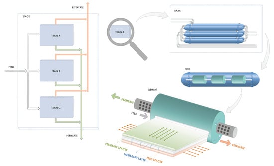 Membranes constitute excellent alternatives for gas separations due to their low installation and maintenance costs. In the industrial environment, membranes are usually organized in modules with spiral-wound or hollow fiber geometries. Hollow fiber separation units are normally applied to relatively smaller fluxes when compared to spiral-wound modules. On the other hand, spiral-wound modules are cheaper, capable of handling higher operating pressures, and are more resistant to scaling, as particles present in the feed gas stream can block the fine membrane fibers [20,21]. Because of that, the spiral-wound units are largely used in industrial gas separation processes. In a previous work of our group, a mathematical model based on a phenomenological approach for a leaf of a spiral-wound membrane was developed. The model was validated in four case studies of common gas separations, with very good performance and robustness. Furthermore, it allowed the prediction of flow rates and concentrations along the membrane leaf, which are important features for the understanding of membrane operation processes. In addition, a discretization method was proposed to solve the model, which proved to be faster and more efficient than the shooting method [22]. It is also important to emphasize that industrial spiral-wound membrane separation units for CO applications are formed by several leaves, which are wounded onto a central perforated collecting tube, forming one modular separation element. These elements can be arranged in series to build a membrane separation tube. Then, tubes can be organized in parallel to form a bank. Finally, the banks can be aligned in parallel to compose a membrane separation train, while the trains can be arranged in parallel to form a stage [21]. Figure 2 shows an example of this kind of unit.