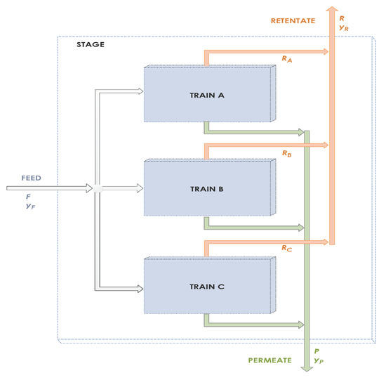 - Flowrates: Total Feed (F), Total Retentate (R), Train Retentate and C ( and ) [];