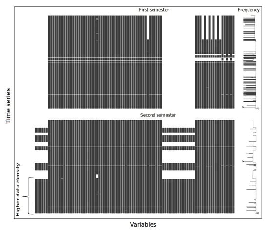 The Missingno library was used to analyze the missing data [45]. In Figure 4, one can observe the data density, visualizing completely the pattern of missing data in the whole set, with the columns representing the variables and lines representing data points of the time series. In addition, a frequency bar that indicates the number of variables measured at each particular timeline can be seen on the right side of the graph.