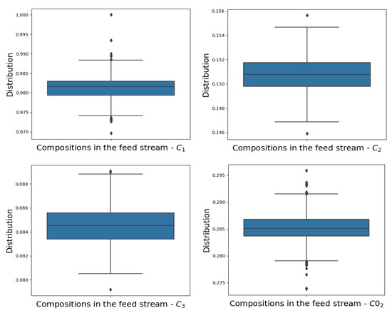 Analysis of boxplots for compositions , , , and CO in the feed stream.