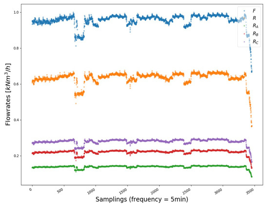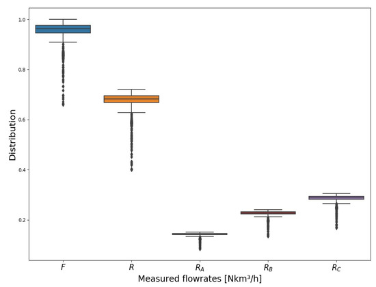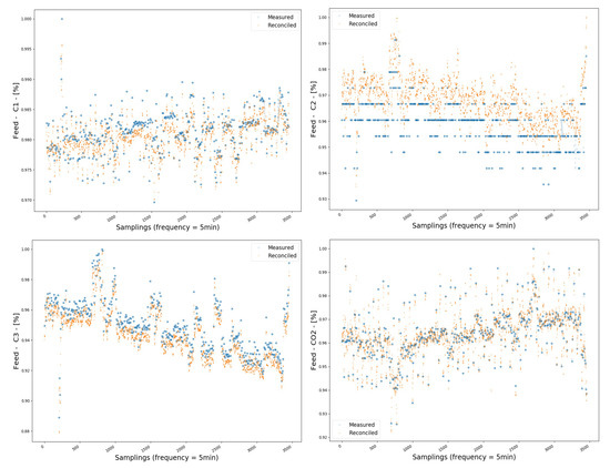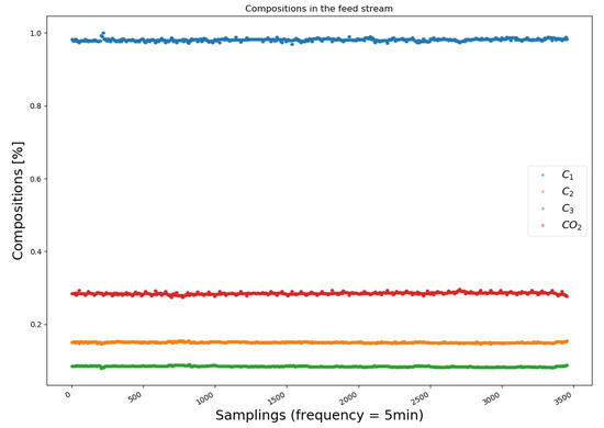 Figure 7 illustrates the time series for the compositions of , , , and CO in the feed stream, while Figure 8 shows the feed and retentate flowrates, for the same time ranges analyzed in the boxplot. Therefore, it becomes evident in the case of flowrates that the supposed gross errors actually indicated a change in operation and not a failure of the sensor. In the case of composition, outliers can possibly be assigned to gross errors, although only the DR can allow the proposition of reliable statements about the alleged gross errors.