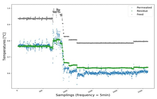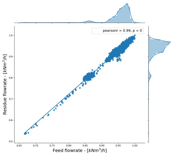 In the analyzed process, the permeate flow was not measured. It must be emphasized that this is not unusual at real industrial sites. However, through DR, this information can be obtained with the help of the model, after the application of the DR procedure. The complete set of temperature and pressure was not available either, which is not unusual at the plant site. In the analyzed case, the pressure of the feed stream and the temperature of the permeate stream were not measured. Therefore, the full implementation of the energy balance in the proposed DR procedure was not viable due to the lack of observability. For this reason, the pressure of the feed stream was evaluated through calculation of the pressure loss in the separation stage, based on design data and the pressure data of the retained stream. In this case, after characterization of the pressure loss, the energy balance equation can be used to estimate the permeate stream temperature, with the aid of Equation (11), calculating the enthalpies of the process streams with the Peng–Robinson equation of state [44]: