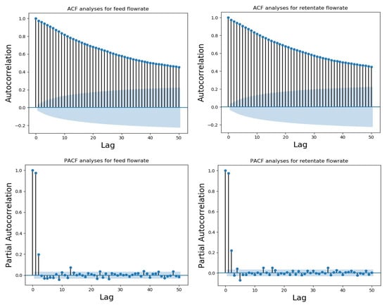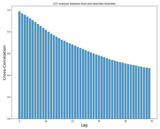 Analyzing the correlations, autocorrelations, and cross-correlations between pairs of variables of interest allows the characterization of stationarity, seasonality, and regions of operation of the process [33,34]. Observing correlations between input and output flows can indicate process stationarity. The absence of correlation can indicate the occurrence of significant nonlinearity or dynamics in the process response [35]. For dynamic responses, cross-correlation can capture the lags between the actions on the input variables and the steady-state of the output variables. Obviously, the identification of dynamic correlations among the many variables of the system may indicate the necessity to build and implement dynamic models for more accurate representation of the available data. For this reason, proper characterization of stationarity can be important for more successful implementations of monitoring procedures [36].