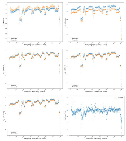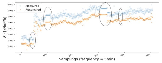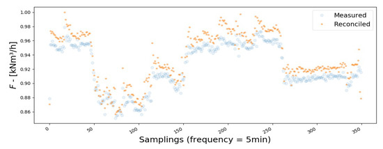 In the DR stage, measured data are adjusted in a statistically coherent manner by an estimator, which frequently is based on the maximum likelihood principle, with the support of a statistical distribution admitted a priori for measurement fluctuations. According to the DR technique, adjusted data must satisfy the conservation laws and other constraints imposed on the system, maximizing the probability of occurrence of that particular measurement and, simultaneously, respecting the mathematical model of the process. Thus, more reliable estimates can be obtained for the variables and parameters of the process [13,15]. Traditionally, the normal distribution is assumed to be valid, which results in the Weighted Least Squares (WLS) estimator [16]. For illustrative purposes, data rectification applications in the industry can be implemented as shown in Figure 1.