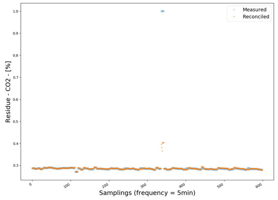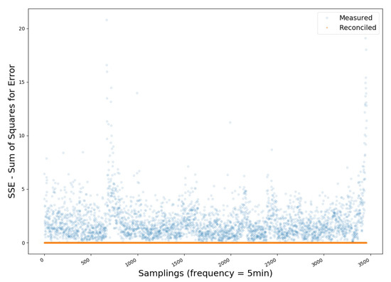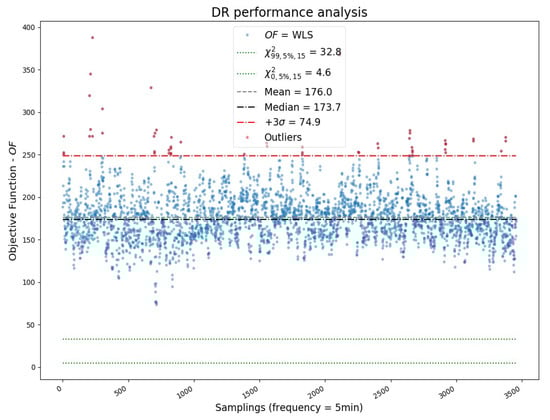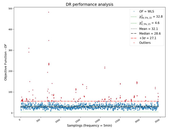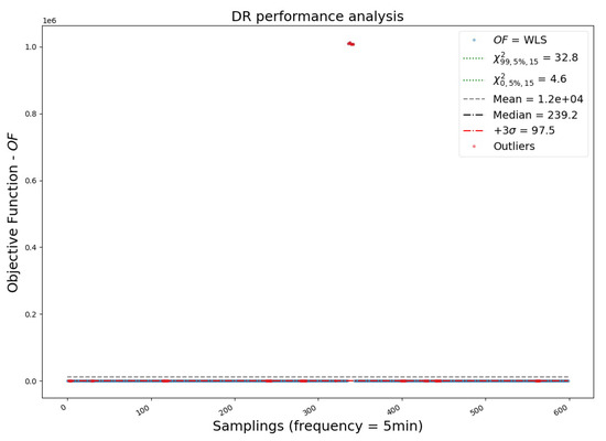 A test to observe the influences of biases on the analysis and performance of DR was performed. Figure 26 and Figure 27 illustrate the same analyses performed for the same time window, as presented in Figure 24 and Figure 25, but after identification and compensation of outliers. It can be observed that outliers significantly affected the average OF value. Based on Figure 24, Figure 25, Figure 26 and Figure 27, it can be said that the analysis of bias and outliers performed very well. Figure 27 also illustrates the benefits of bias and outlier adjustments, as objective function values were reduced significantly and shed light on the existence of persistent outlier measurements. This reinforces the importance of bias and gross error diagnosing and the necessity to involve maintenance teams for evaluation of the instrumentation performances.