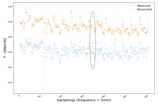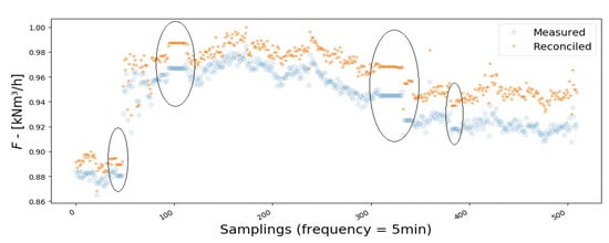 Figure 6 shows that the “gross errors” followed a downward trend, with highest concentration below the modal value. This is because a drop in the process flowrate was observed during this period. Therefore, in this case, the analysis interprets that the operating changes are “gross error”, when they are not. On the other hand, the good behavior of the data indicates that the flowrate was measured with good precision. Instrumentation accuracy was also analyzed after DR, with help of the bias analysis.