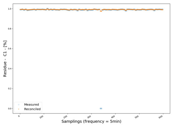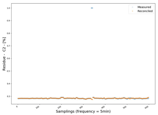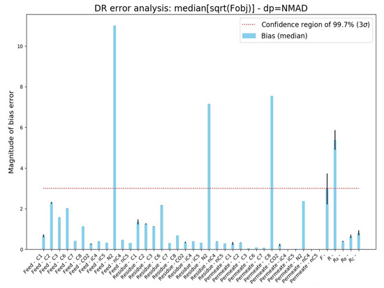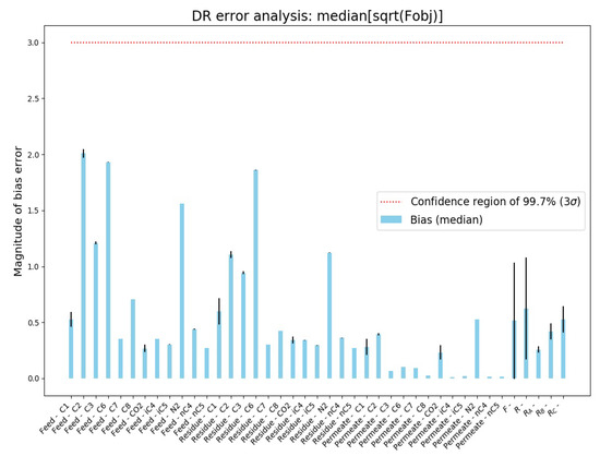 The analysis of bias can be performed through dynamic bar graph monitoring, illustrating the magnitude of the errors of each variable. Figure 24 informs the magnitudes of the systematic deviations from the median, that is, how many times the reconciled variable deviated from the measured median value. Systematic deviations that are larger than three times the value of the standard deviation can be regarded as a bias. Therefore, analyzing Figure 24, five variables with measurement biases could be observed: N2 (feed); N2 (residue); C8 (permeate); feed flowrate; and residue flowrate. Generally, biases can indicate the occurrence of unbalanced measurements, calibration problems, and instrument malfunctioning. For this reason, the obtained results were relayed to maintenance teams for evaluation of the instrumentation performances.