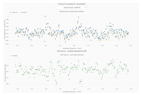 In each new cycle of data acquisition, the code runs in sequence the pre-treatment, statistical tests and outlier compensation, data reconciliation with the permeate flowrate estimation, and finally the energy balance to calculate the temperature of the permeate flowrate. The first inferred variable was the permeate flowrate, estimated within the data reconciliation procedure. Figure 28 illustrates the real-time monitoring of the inferred variable.