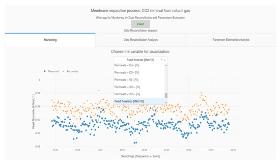Based on the previous paragraphs, the main objective of the present work is to develop and implement a web application that makes possible the online and real-time monitoring of membrane CO separation processes on an industrial scale for the first time, based on rigorous numerical and statistical procedures. The application can also be used to provide information about unmeasured variables (soft sensor) and to diagnose the occurrence of gross error measurements and instrument malfunctioning. The proposed methodology comprises the following stages: (i) pre-treatment and characterization of process data; (ii) data reconciliation of process data to minimize measurement uncertainties, with the aid of mass balance equations; (iii) detection of systematic deviations for identification of process malfunctions; and (iv) observation of unmeasured variables (soft sensor or digital twin). Finally, the proposed data acquisition and visualization system is implemented online for successful monitoring of an actual industrial membrane separation site in real time for the first time.
