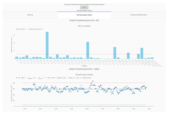 Using the available data and the model equations, the DR procedure (as described in the following paragraphs) was solved offline to validate the proposed procedure and determine some performance indexes. Particularly, a statistical metrics was used to describe the magnitudes of the deviations between measured and reconciled variables. Then, the model was used offline for calculation of unmeasured variables, providing the soft sensor (or digital twin) response. Finally, the proposed procedures were implemented online and in real time.