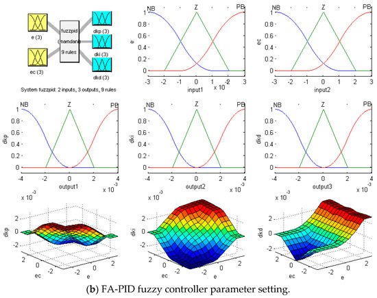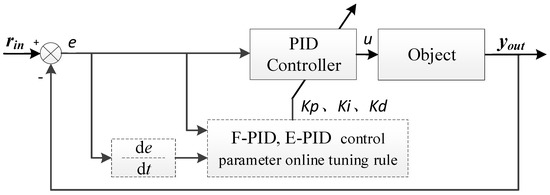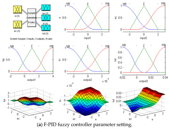 The online-tuned control parameters of F-PID are calculated as Equations (5)–(7), where , , are outputs of fuzzy computing.