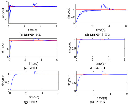Comparison for robust (anti-interference) analysis: (a) BPNN-PID; (b) WNN-PID; (c) RBFNN-PID; (d) RBFNN-S-PID; (e) E-PID; (f) EA-PID; (g) F-PID; (h) FA-PID.