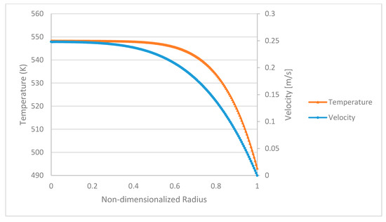 The velocity and temperature profiles based on the temperature-dependent Carreau–Yasuda equation at the entrance of the die are shown in Figure 2.