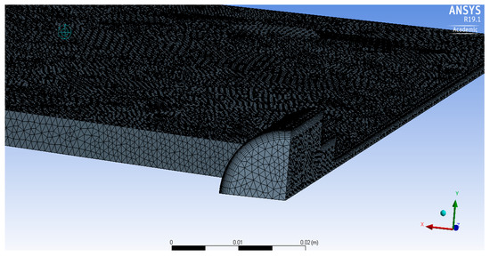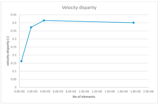 Due to symmetry, only one quarter of the die cavity geometry was selected. Different meshes with different numbers of elements were constructed. For every mesh, simulation was performed and compared. As shown in Figure 3, meshes with 500,000 elements and higher show negligible change in both velocity disparity and pressure drop. As a result, these mesh elements are selected for the next simulations. Figure 4 shows the mesh grid for the independent variables of H = 5 mm, W = 36 mm, H1 = 216 mm, H2 = 124.6 mm, and H3 = 48.3 mm. The radius of the pipe that connects from the extruder to the die is 10 mm.