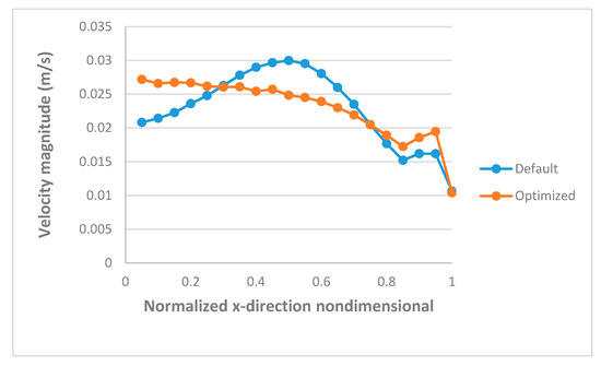 Figure 7 and Figure 8 show the velocity distribution in the cavity and across the die exit, respectively. The velocity disparity values for the default design (Winter type) and the optimal design are found to be 0.68861 and 0.55035, respectively. This shows a 20.07% improvement in the velocity distribution at the exit of the extrusion die compared to the default die. Near the edge of the die, where the manifold reaches the slit, there is a spike in the velocity before it falls to zero at the wall of the die. As it can be seen, maximum velocity occurs at a little bit further distance from the entry of die. This demonstrates the insufficiency of the power law.