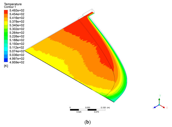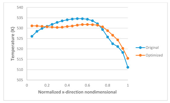 Figure 10 shows the temperature distributions for the initial and optimized dies. Both contours look similar. A comparison of temperature distributions at the outlet of the die for the initial and optimized dies is depicted in Figure 11. As it is shown, the optimized die has more uniform temperature at the outlet. As discussed before, the optimized die gives more uniform velocity. Uniform velocity results in a more uniform temperature profile at the exit of the die. Since polymers are susceptible to degradation due to the high temperatures, an optimized die with more uniform velocity is more desirable.