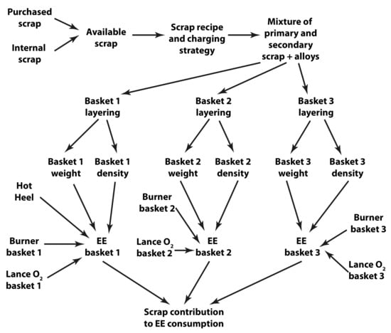 In addition, the EE consumption is partly governed by the selected scrap mix in the steel plant. This has been schematically illustrated in Figure 2. The available scrap in the scrap yard sets the limit to the charged scrap mixture in each basket. The charging strategy, comprising of both the scrap types and the layering of the basket, determines the exposed surface area of each scrap piece to the hot heel and the furnace arcs during the process. The burners and oxygen lancing facilitate the melting of the scrap. These factors in combination determine the aggregated melting time of the baskets combined. An increased melting time contributes to a longer TTT, which increases the total heat losses during the process. The increased heat loss has to be counteracted by increased amount of energy sources, which is a combination of EE consumption, burner fuel, and oxidation by alloying elements in the scrap (Table 1).