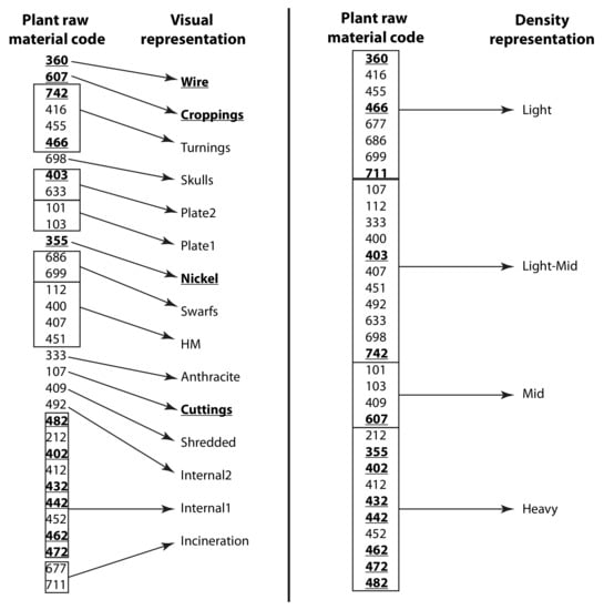 The scrap types will be represented in three distinct ways. The first representation will use the scrap codes from the steel plant of study, i.e., scrap type. The second representation is based on a visual categorization of each scrap code with the aim to provide an intuitive categorization for the steel plant engineers as well as to minimize the number of distinct scrap categories. The third representation is based on the estimated apparent density of each scrap code. The estimated apparent densities are both from established technical specifications as well as from estimations conducted by the plant engineers. The relations between the three scrap representations can be seen in Figure 3. Henceforth, the term scrap representation will refer to either of the three distinct scrap representations and the term scrap category will be used to specify a specific category in either of the visual or apparent density categorizations. The term scrap type will be used to refer to a specific scrap type as defined by the steel plant coding system.