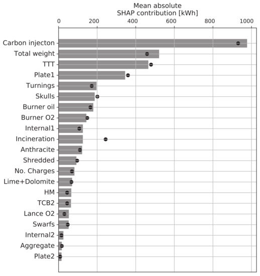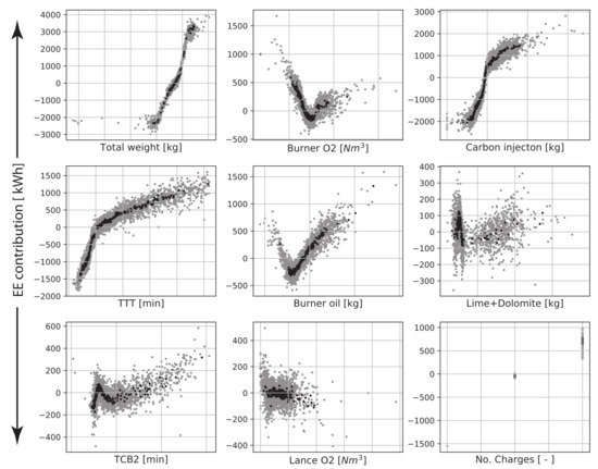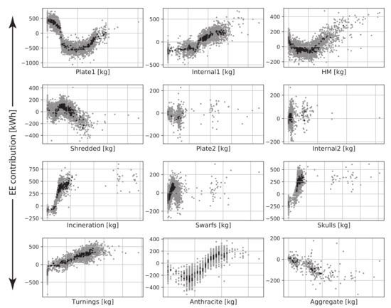 Many articles have studied and proposed statistical models predicting the EE consumption of the EAF [1,2]. However, only a handful of studies have used scrap types as input variables to a statistical model predicting the EE of an EAF [2,3,4,5,6,7]. Neither of these studies analyze the contributions of each scrap type on specific predictions by the statistical model. Verifying the effects of the input variables on the complete prediction space is paramount to evaluate the practical usefulness of any statistical model let alone to make the users, i.e., process engineers, trust the model. Only when these two conditions are met can the model possibly be used to solve practical problems. An example of a practical problem where an EE prediction model can be used is when determining the EE requirement for the EAF in a Demand Side Management (DSM) system, which optimizes the processes in a steel plant with respect to the available power in the transmission line [8].