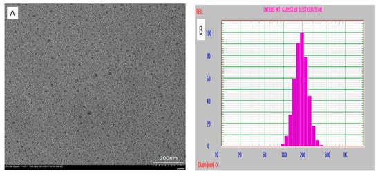 Figure 2. (A) TEM image of the dried dPNP and (B) the particle size distribution of the hydrated dPNP.