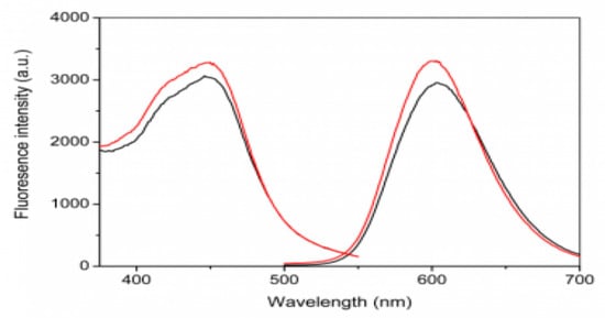 Figure 3. Fluorescent excitation (low wavelength) and emission (high wavelength) spectra of dPNP (red) and ruthenium complex epo–Ru (black).