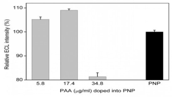 Two polymers doped in the nanoparticle dPNP, anionic polyelectrolyte PAA and cationic polymer PEI, played different roles in the ECL enhancement of the nanoparticle. Their ECL intensities were measured according to §2.4. Compared with the undoped polymer nanoparticle PNP, which was self-assembled by the electrostatic and the hydrophobic interaction of PAA–Ru, the added PAA in the PAA–Ru system led to the enhancement of the ECL of PAA-doped nanoparticle paa–PNP (Figure 4). The ECL intensity reached the maximum at the doping amount of 17.4 μg mL−1 and decreased as the doping amount was further increased. The results showed that PAA doping could enhance the ECL intensity of the undoped polymer nanoparticle PNP to 109.1%. As PAA is a non-ECL component, so this ECL enhancement should be derived from the polyelectrolyte property of PAA. Due to highly charged anionic long chain of PAA with a high molecular weight of 100 KD, it was able to enhance the electron transfer of the grafted epo–Ru inside the nanoparticles, thus improve the electrical excitation efficiency of the working electrode to the internal grafted epo–Ru. In fact, our previous research on the ion-pair macromolecules PAA–Ru(bpy)32+ doped SiO2 nanoparticle has demonstrated that the long chain PAA involved in the non-electroconductive nanoparticle can enhance the electric conductivity of the particle [17]. The decrease of the ECL intensity in higher doping amount of the PAA (more than 17.4 μg mL−1) may be due to the reduction of the relative amount of luminescent polymer PAA–Ru in the doping nanoparticle paa–PNP.