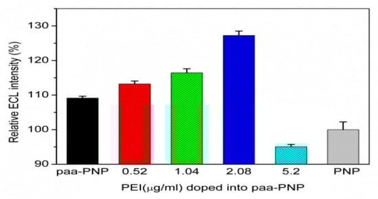 The effect of the co-doping of the non-luminescent polymer PEI on the ECL of the dPNP was also investigated (Figure 5). It was found that PEI co-doping could further enhance the ECL of PAA-doped polymer nanoparticle paa–PNP, even the PAA doping amount was the above optimized amount of 17.4 μg mL−1. From the results in Figure 5, the ECL intensity of the nanoparticle enhanced with the increase of the amount of doping PEI and when PEI increased to 2.08 μg mL−1, it reached the maximum of the ECL signal to 116.6%, compared with PAA-doped polymer nanoparticle paa–PNP and 127.3% compared with the undoped polymer nanoparticle PNP. Of course, the excessive amount of PEI would also lead to the decrease of the relative content of the ECL component PAA–Ru in the nanoparticles, resulting in the decrease of ECL intensity.