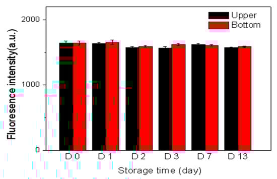 The better is the suspension stability of antibody connected nanoparticles in aqueous solution, the more convenient is the storage for a detection reagent, and the better is the reproducibility of detection method. Therefore, we investigated the suspension stability of the dPNP in the solution. The aqueous solution of dPNP was kept in the reagent bottle at room temperature, avoiding light and statically. Meanwhile, drew a line at upper 1/5 of the solution height, which is near the top of the solution, and another line at down 1/5 of the solution height, which is near the bottom of the solution. Moreover, the corresponding solution layers are called as the upper layer and the bottom one, respectively. Under static condition, a small amount of the solutions at the upper and bottom layers of the reagent bottles were sucked out gently on the first, second, third, seventh and thirteenth day, respectively to detect their fluorescence intensities (Figure 7). It was found that the fluorescence intensities of the upper and the bottom solutions remained almost constant for 13 days, and the intensities did not show a statistical difference between the upper layer and the bottom one. Since the measured fluorescence intensities result from the fluorescent nanoparticles dPNPs in the solution, this indicates that the nanoparticle could uniformly distribute in the solution during long-term storage and had good suspension stability. In fact, this good characteristic should also ascribe to the novel structure of dPNP. The rich residual PAA chains on the surface of dPNP made themselves have rich surface negative charges and good hydrophilicity, thus effectively avoiding the accumulation and precipitation.