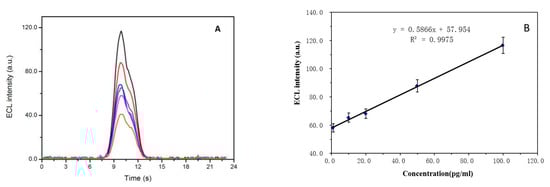Figure 8. (A) ECL intensities of the detected immune complex of the antigen HBsAg at the concentrations of 0.0, 1.0, 10.0, 20.0, 50.0 and 100.0 pg mL−1 in the detecting system and (B) the corresponding linear relationship between the concentrations of the detected HBsAg and their ECL maximum intensities (n = 3, mean + SD).