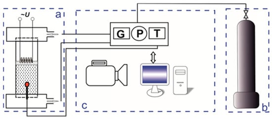Scheme of an experimental equipment for studying combustion metals under forced filtration. (a) a reactor; (b) a gas supply unit; (c) a unit for registering and processing data.