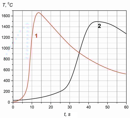The temperature profiles obtained by combustion of powder (1) and granules (2) of chromium: q = 12 cm3/(s·cm2); [N2] = 100%.