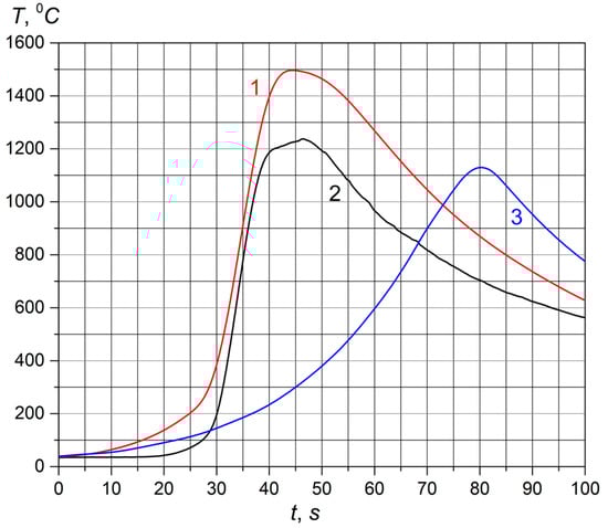Temperature profiles at different argon content: q = 12 cm3/(s·cm2); 1—[N2] = 100%; 2—[Ar] = 12.8%; 3—[Ar] = 24%.
