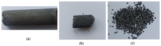 The photographs of synthesized Cr2N samples are presented in Figure 7. A sample of Cr2N, obtained by the combustion of chromium powder, is shown in Figure 7a. A sample of Cr2N obtained by the combustion of granules of chromium is shown in Figure 7b,c. It has been established that, in the case of the combustion of chromium powder, and in the case of the combustion of granular chromium, the combustion products retain their initial structure. Synthesized Cr2N samples are easily destructible gray sinter. Milling the combustion products results in particles of the initial size.