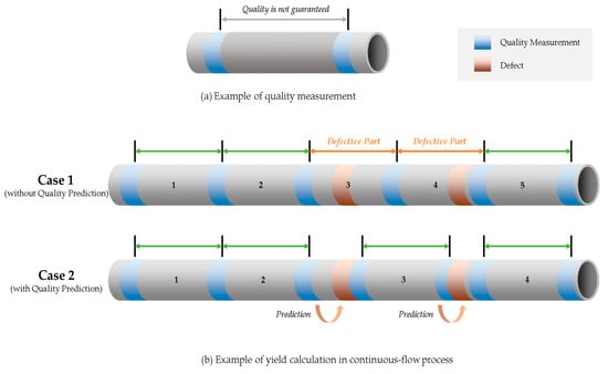 Specifically, this study conducts the data analysis on the continuous manufacturing process with the use of the sensing data of the plastic core extrusion process of a company. Based on the analytic results, yield can be improved by predicting defects in advance and updating production plans. First, for the effective quality management of the continuous manufacturing process, we analyzed the conventional manufacturing process. The problems of it are as follows. Even though well-designed production and quality data are required for better quality management, collecting the data takes a lot of time and cost. For this reason, small and medium-sized enterprises (SMEs) have difficulty for obtaining such data. For example, as shown in Figure 1a, in the extraction process for manufacturing a cylinder product, it is necessary to measure both ends of the product in terms of quality. Therefore, the quality in the middle of the product is not guaranteed.