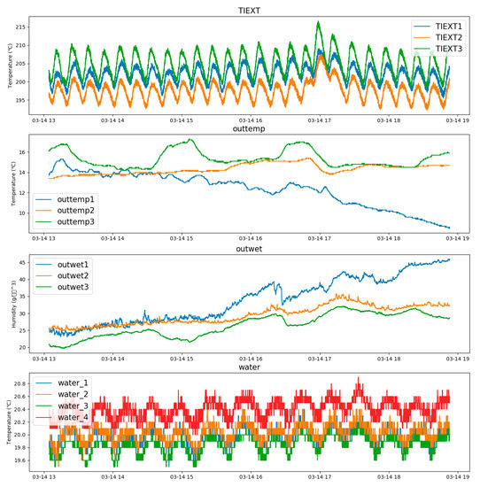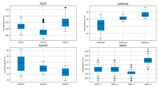 To find the characteristics of each data, we conducted a statistical analysis of the line graph and box plot. Figure 2 illustrates the line graphs of the features of continuous data. TIEXT1~3 and Water_1~4 followed a similar trend by the sensor. Nevertheless, a temperature was changed depending on a sensor position so that it went up or down overall. However, Outtemp and Outwet are changing irregularly. Through this, it can be seen that TIEXT and Water are control variables and Outtemp and Outwet are measurement variables.