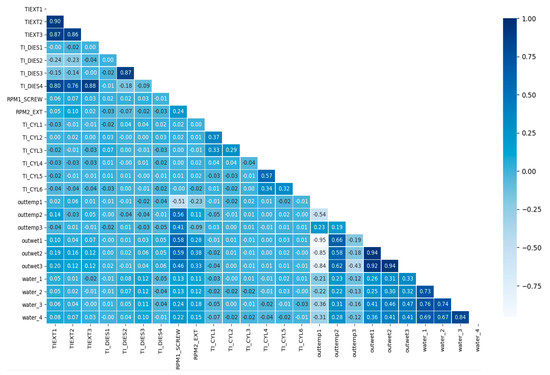 The results from the correlation analysis on features are shown in Figure 4. Pearson correlation coefficient was applied, in which a correlation coefficient is a value between–1 and +1. The closer the coefficient is to ±1, the more there is a correlation. A correlation coefficient was presented with different color temperature. The larger a correlation coefficient is, the darker the color temperatures are. According to the analysis, the correlation coefficients of the sensors in close proximity, such as extrusion temperatures (TIEXT1~3) and dice temperatures (TI_DIES2~3), were mostly high. Aside from that, the correlation coefficients between TIEXT, TI_DIES4, Outwet, and Outtemp1 were high.