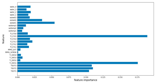 Feature Importance was analyzed in order to find which features were considered to be critical factors in data classification by decision tree as shown in Figure 5. In terms of feature importance, the top five features of all were TI_CYL5, TI_DIES1, and TIEXT1~3, each of which scored 0.1896, 0.1757, 0.1101, 0.1085, and 0.1046. The top five of 25 features accounted for 69% influence.