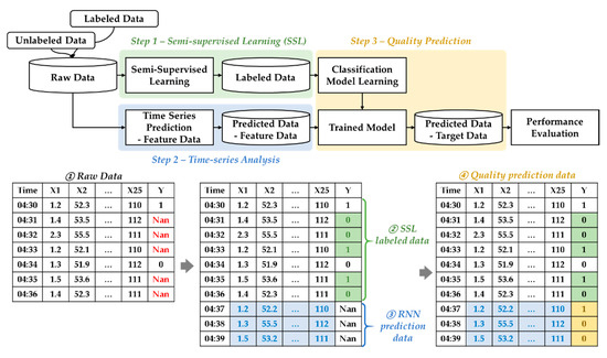 The framework in the second experiment is illustrated in Figure 6. The whole process is divided into Step 1, Step 2, and Step 3. In Step 1, on the assumption that unlabeled data and labeled data coexist, unlabeled data is labeled through SSL. In Step 2, the future value of feature data is generated through time-series prediction. In Step 3, quality is finally predicted and classified on the basis of the labeled data created in Step 1 and the data created through time-series prediction in Step 2.