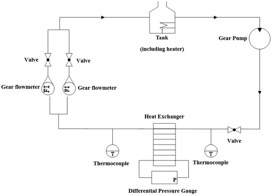 The pressure measurement system uses a Rosemount 3051S differential pressure flow transmitter (EMERSON, Shakopee, MN, USA) (range: 0~250 kPa, uncertainty: ±0.2%) to measure the pressure drop of the heat exchanger. The temperature control system consists of a liquid storage tank, a heating belt, a temperature controller, an agitator, etc. The flow measurement system is mainly composed of the MIK MIKD-LC-A series oval gear flowmeter (YUTUO, Hefei, China), filter (HGVALVE, Shanghai, China), buffer tank (DAERTUO, Huai’an, China), and gas-liquid separation tank (HUATENG, Foshan, China). The parameters of the MIK MIKD-LC-A series oval gear flowmeter are listed in Table 1. The power system is mainly composed of gear pumps and frequency converters. The pressure difference value is collected by the NI data collector, and the data is recorded using LabVIEW.