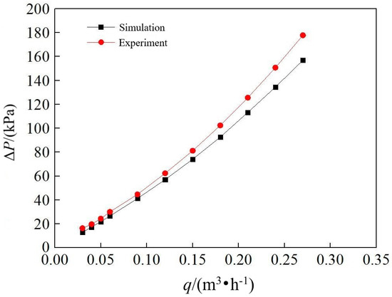 The comparison results are shown in Figure 7. It can be seen from Figure 7 that the relationship of the simulation is consistent to the experimental result, and the deviation between the numerically and experimentally pressure differences is small, with a maximum deviation of about 11.4%.