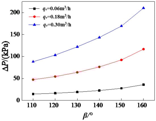 The effects of corrugated angle β on the pressure drop (h = 2 mm, λ = 7.6 mm) are shown in Figure 8. It is noticed that the pressure drop increases with the increasing corrugated angle. The pressure drop reaches the maximum when the corrugated angle is 160°. The pressure drop is a parameter that characterizes the resistance characteristics of fluid flow. In the B3-014 chevron plate heat exchanger, the tangential force of the plate on the fluid and the resistance of the contact to the fluid are the main reasons for the pressure drop. With the increase of the angle of the corrugation, the tangential force of the plate on the fluid and the resistance of the contact to the fluid increase. Therefore, in the range of the corrugated angle between 110 and 160°, the resistance of the flow increases when the corrugated angle is large and enlarged.