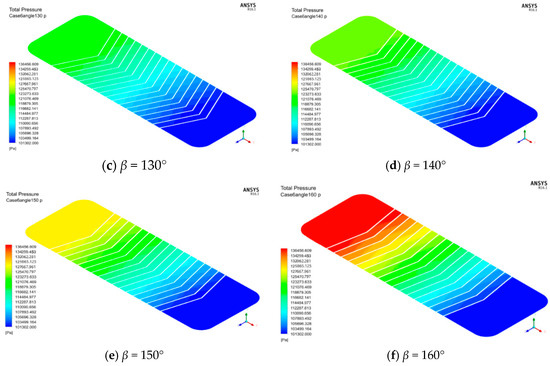 The pressure distribution charts when h = 2 mm, λ = 7.6 mm are shown in Figure 9a–f. It is noticed that the pressure values near the outlet area of the heat exchanger are all similar under the different angles. The high-pressure area increases and the inlet pressure increases with the increasing corrugated angle. Therefore, as far as the current simulated operating range is concerned, when the corrugated angle is small, the flow pressure drop can be reduced.