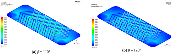 The speed distribution charts of the plate where the plate contacts are located when β = 130°, λ = 7.6 mm are shown in Figure 13a–c. It is noticed that with the increase of the corrugated height, the blue low-speed area behind the contact decreases; the proportion of the fluid occupied by the cross flow increases, and the tortuous fluid decreases, the smaller the disturbance effect of the contact on the fluid, and the smaller the vortex formed behind the contact. Therefore, as the corrugated height increases, the blue low-speed area behind the contact decreases. With the gradual increase of the corrugated height, the flow form changes into a tortuous flow. A single contact has a strong disturbance effect on the fluid, causing the fluid to form a vortex behind the contact. Therefore, the vortex generated is larger, and the velocity distribution becomes more and more uneven with the increasing corrugated angle.